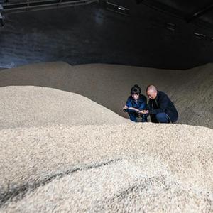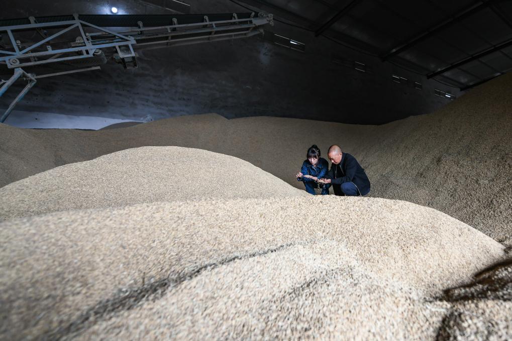 10月10日,在成都崇州市隆興鎮,王伶俐(左)和父親王志全在查看今年新收獲水稻的品質(zhì)。新華社記者王曦 攝