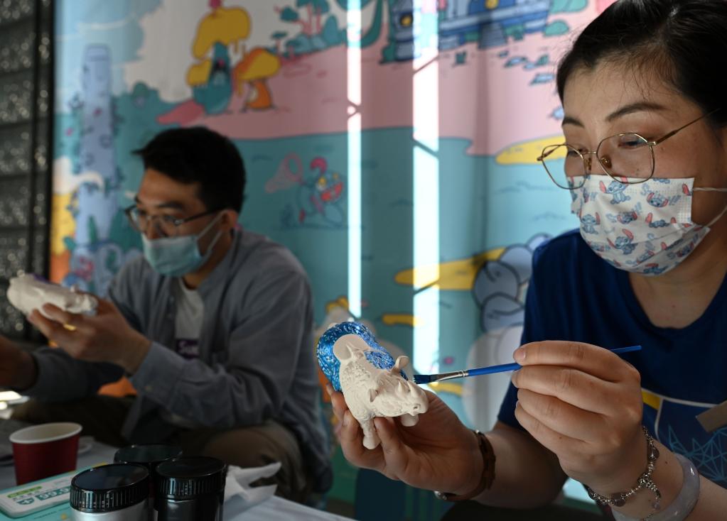 2023年5月18日,市民在犀牛尊素胚上涂色。犀牛尊以國博館藏重器“錯金銀云紋青銅犀尊”為原型。 新華社記者 金良快 攝