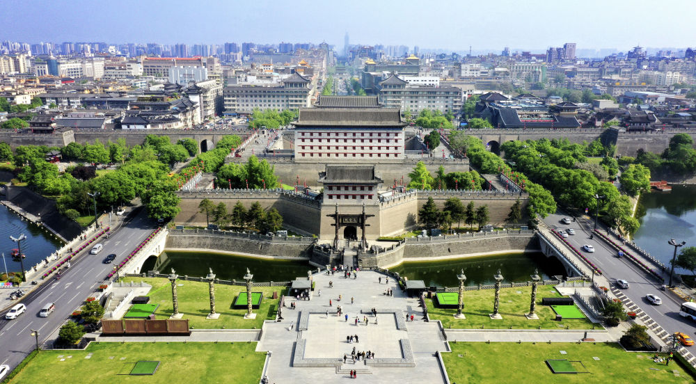 西安城墻永寧門(mén)(2023年4月25日攝,無(wú)人機照片)。新華社記者 劉瀟 攝