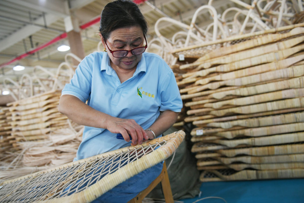 工作人員在位于漢中市的陜西良順匠心實(shí)業(yè)有限公司編織藤制品(2023年9月7日攝)。新華社記者 張曼怡 攝
