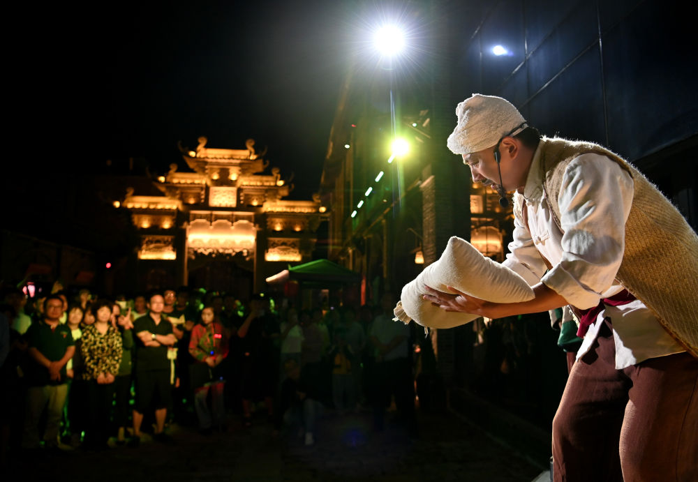 游客在長(cháng)安十二時(shí)辰主題街區觀(guān)看唐風(fēng)演藝《將進(jìn)酒》(2023年8月2日攝)。新華社記者 鄒競一 攝