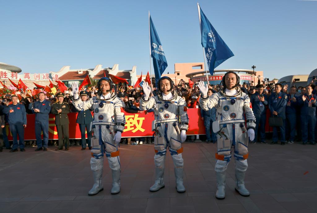 10月26日上午,神舟十七號載人飛行任務(wù)航天員乘組出征儀式在酒泉衛星發(fā)射中心問(wèn)天閣圓夢(mèng)園廣場(chǎng)舉行。這是航天員湯洪波(右)、唐勝杰(中)、江新林在出征儀式上。新華社記者 李剛 攝