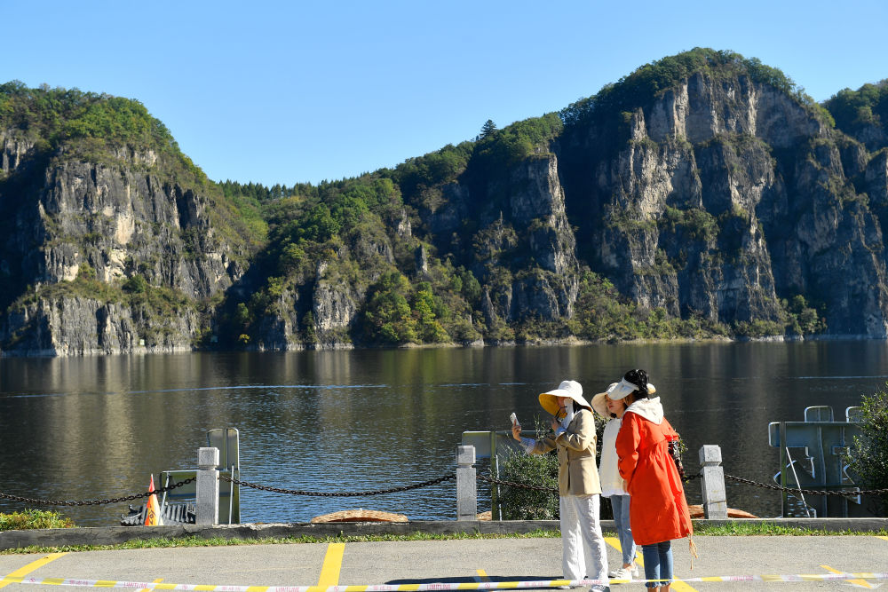 2022年9月21日,游人在白山市松花江生態(tài)旅游風(fēng)景區拍照留念。新華社記者 許暢 攝
