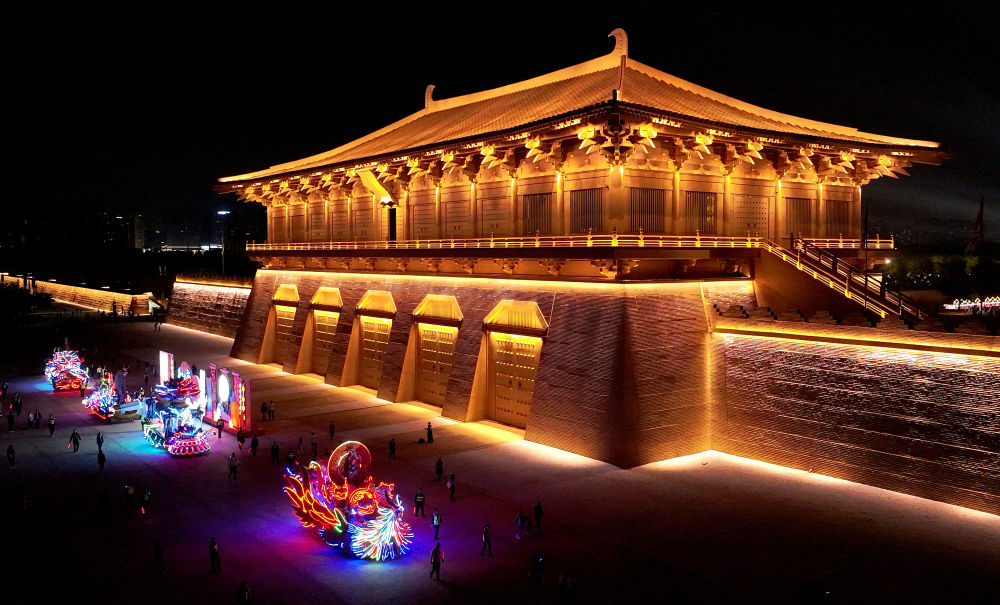 巡游彩車(chē)從西安大明宮國家遺址公園丹鳳門(mén)前駛過(guò)(2023年9月30日攝,無(wú)人機照片)。新華社記者 劉瀟 攝
