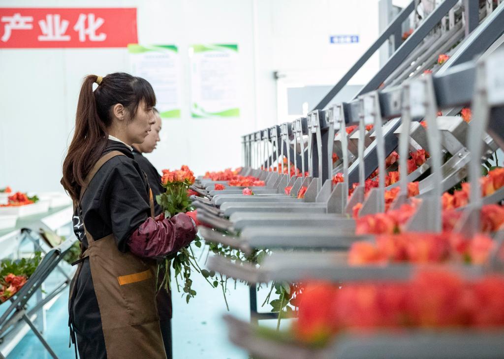 溫室大棚里,“粉紅雪山”等品種的月季鮮切花含苞待放,采花工人穿梭于片片花叢間;廠(chǎng)房?jì)?,高精度的智能分揀機快速運轉,一枝枝鮮花依據枝干長(cháng)度、開(kāi)放度等標準被自動(dòng)分為五個(gè)等級,進(jìn)入流水線(xiàn)的下個(gè)環(huán)節。