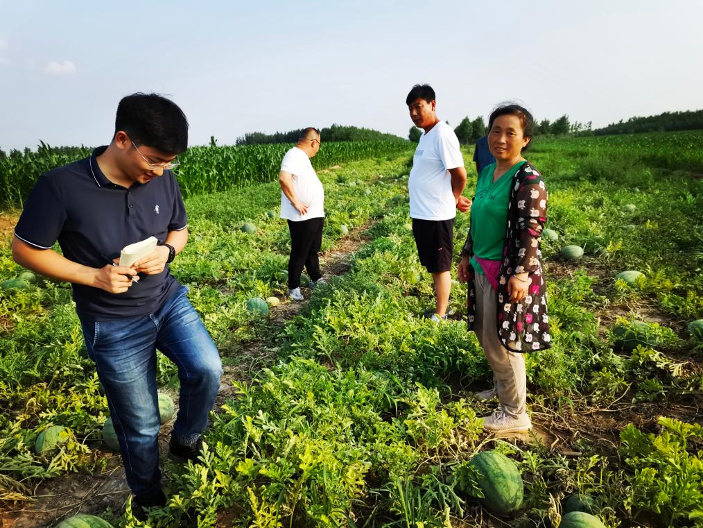在新河縣尋寨鎮,杜一方(左一)在采訪(fǎng)瓜農。(邱英亮 攝)