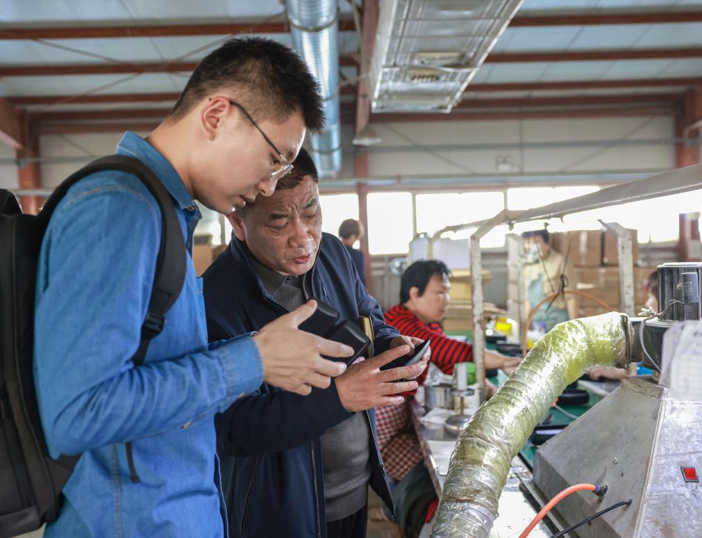 蘇凱洋(左一)在新河縣一家眼鏡盒企業(yè)采訪(fǎng)產(chǎn)業(yè)發(fā)展情況。(李世強 攝)