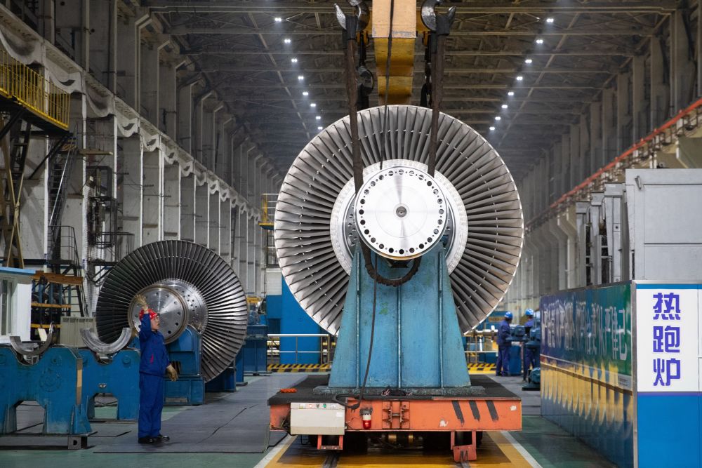 2023年4月28日,工作人員在哈電集團哈爾濱汽輪機廠(chǎng)有限責任公司車(chē)間內工作。新華社記者 張濤 攝