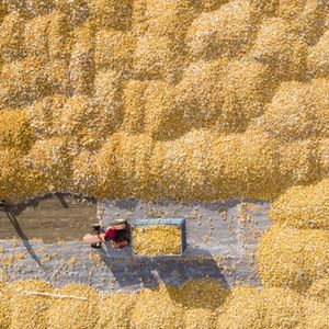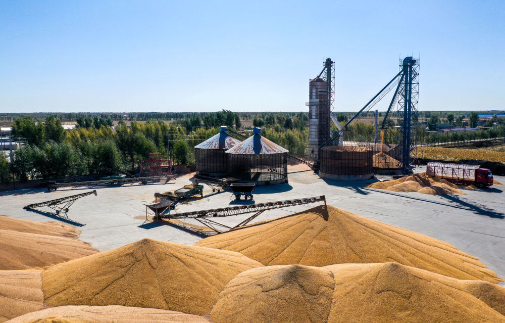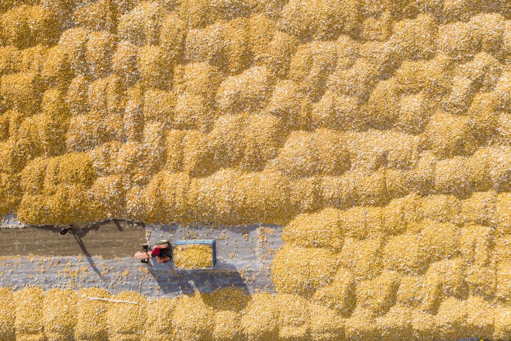 2023年10月19日,在黑龍江省肇東市五里明鎮東升村,農民把收獲的玉米運到當地農業(yè)合作社指定的地點(diǎn)進(jìn)行晾曬(無(wú)人機照片)。新華社記者 謝劍飛 攝