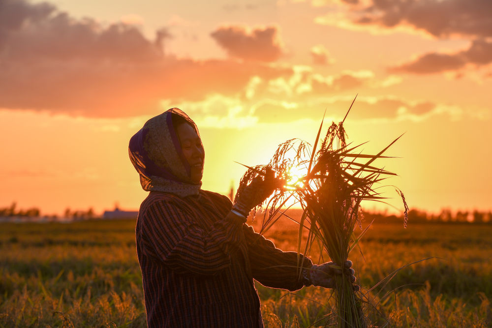 2023年9月12日,在吉林省吉林市永吉縣萬(wàn)昌鎮花家村,農民手持收獲的水稻。新華社記者 張楠 攝