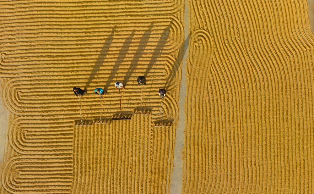 2023年10月12日,在遼寧省燈塔市禾谷茂源水稻種植專(zhuān)業(yè)合作社,農民在晾曬收獲的水稻(無(wú)人機照片)。新華社記者 楊青 攝
