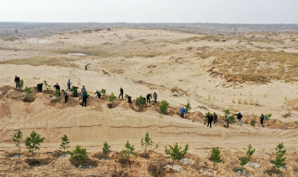2023年4月15日,在內蒙古通遼市科爾沁左翼后旗,治沙工人在科爾沁沙地植樹(shù)造林(無(wú)人機照片)。新華社記者 連振 攝