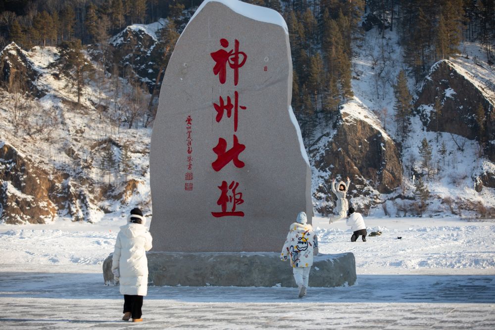 2023年1月10日,在黑龍江省漠河市北極村神州北極廣場(chǎng),游客在拍照留念。新華社記者 張濤 攝