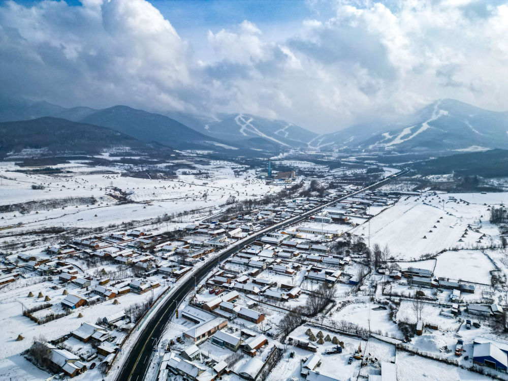 這是2023年1月19日拍攝的吉林北大湖滑雪場(chǎng)附近的北大湖鎮南溝村(無(wú)人機照片)。新華社記者 顏麟蘊 攝