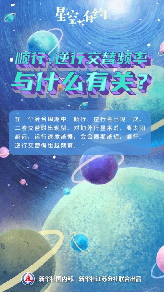 行星順行、逆行的發(fā)生頻率,取決于它們和地球的會(huì )合周期?!巴ㄋ椎刂v,地球和地外行星都在圍繞太陽(yáng)‘跑圈’。地球比地外行星多‘跑’一圈,再次‘追上’地外行星的時(shí)間就是會(huì )合周期?!堋迷铰男行?,地球越容易‘追’上,會(huì )合周期越短?!蓖蹩瞥f(shuō)。