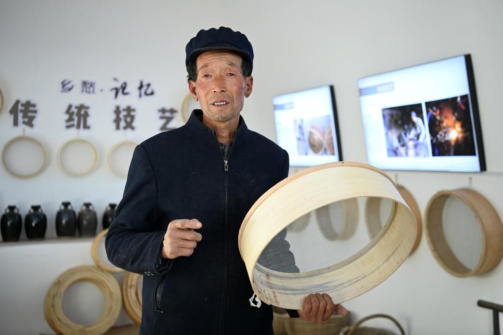 11月30日,在甘肅省環(huán)縣耿塬畔村莊子峁村民小組,村民楊滿(mǎn)銀展示自己制作的籮篩。新華社記者 范培珅 攝