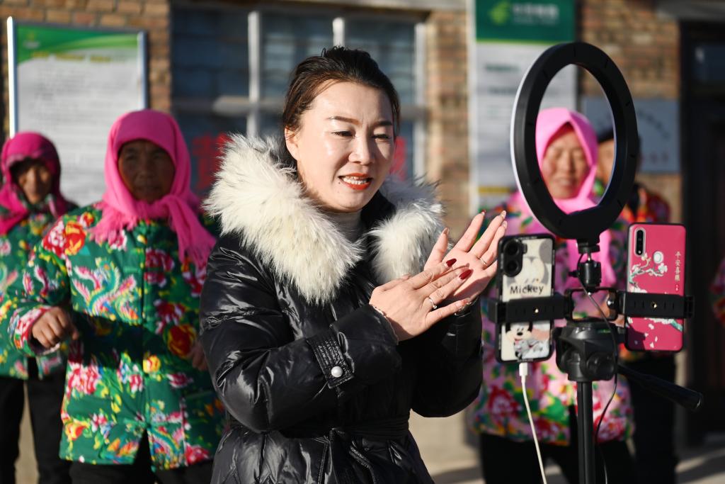 11月30日,在甘肅省環(huán)縣耿塬畔村莊子峁村民小組,楊清艷和幾位村民正在直播。新華社記者 范培珅 攝