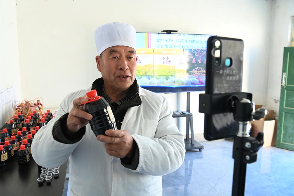 11月30日,在甘肅省環(huán)縣耿塬畔村莊子峁村民小組,村民王克弟通過(guò)直播銷(xiāo)售自家釀制的醋。新華社記者 范培珅 攝