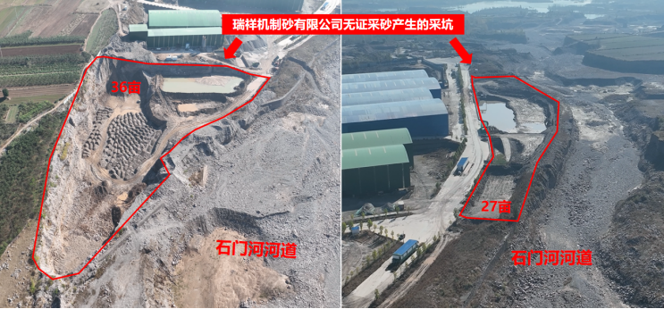 經(jīng)核查,這兩個(gè)采坑面積分別約為36畝和27畝,其中,約19畝和20畝為此河段被劃定為禁采區以后新增開(kāi)采形成。