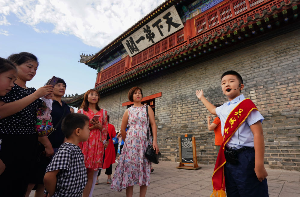 秦皇島市山海關(guān)區“關(guān)城小導游”社會(huì )實(shí)踐班的小導游(右一)在天下第一關(guān)城樓為游客講解(2019年8月22日攝)。新華社記者 楊世堯 攝