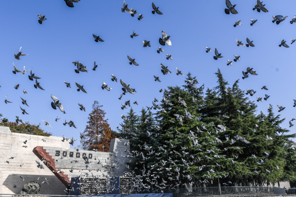 2022年12月13日,南京大屠殺死難者國家公祭儀式現場(chǎng)放飛和平鴿。新華社記者 李博 攝