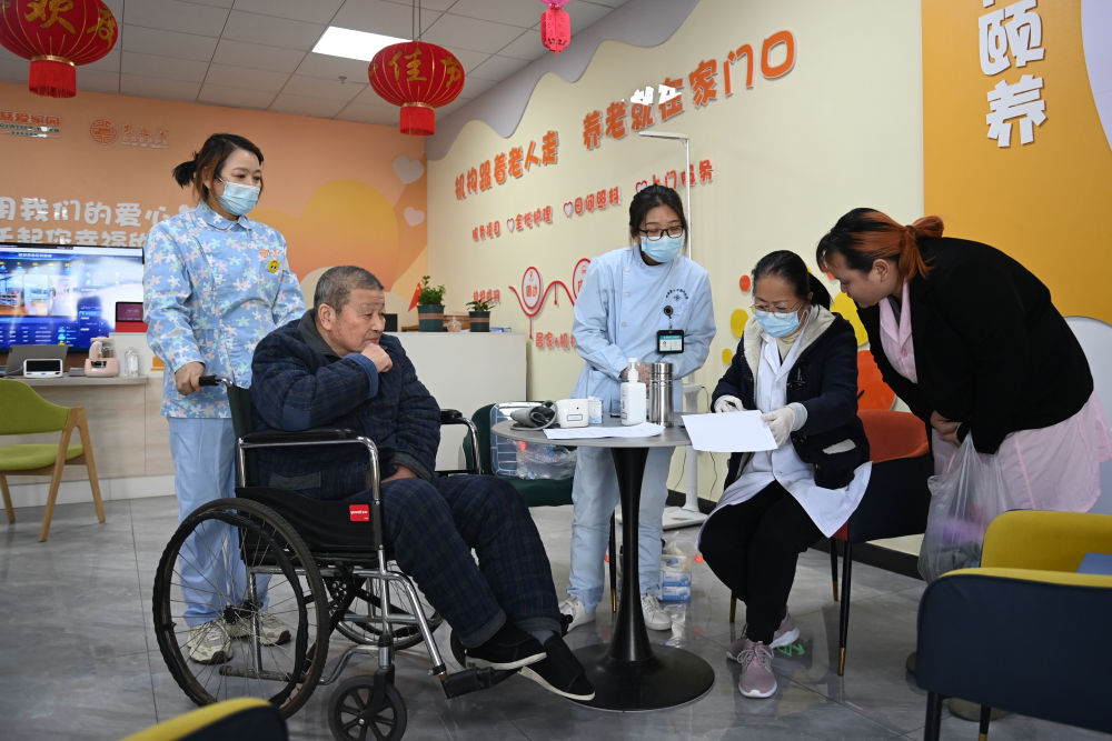 在浙江省慈溪市白沙路街道居家養老服務(wù)中心,81歲老人吳森泉(左二)在接受免費助浴服務(wù)前進(jìn)行身體狀況檢查(2023年11月19日攝)。新華社記者 黃宗治 攝