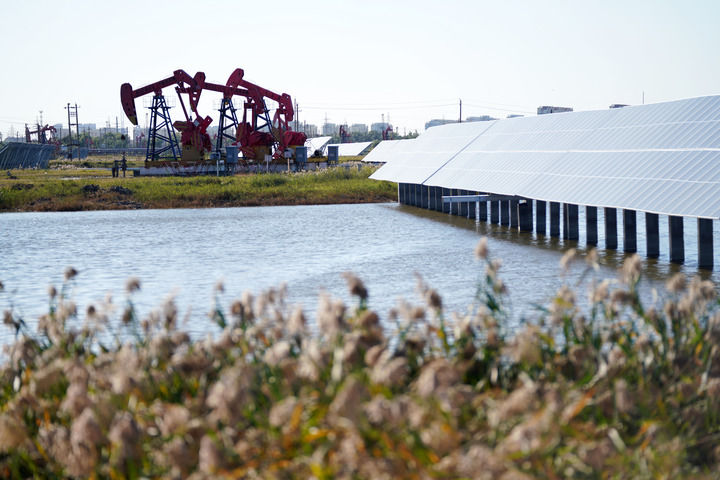 2023年9月19日,在黑龍江大慶油田星火水面光伏電站,電站設施與附近的抽油機相映成趣。新華社記者 王建威 攝