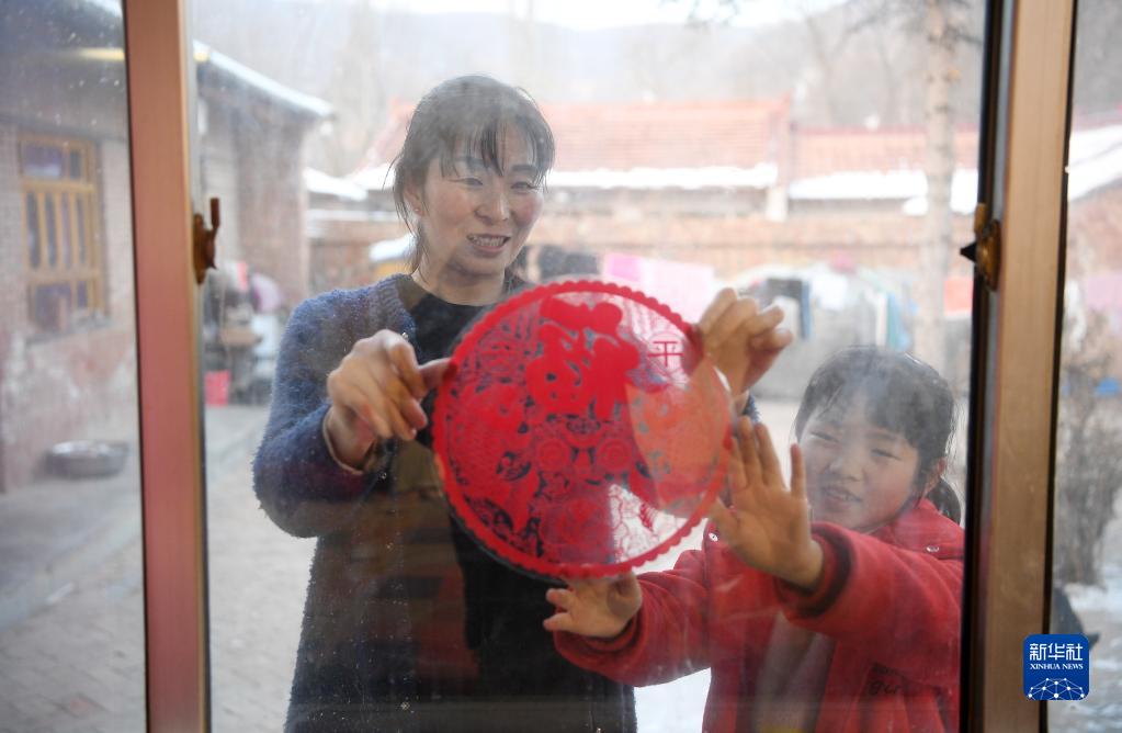 在位于大山深處的寧夏固原市隆德縣鳳嶺鄉于河村,村民馬鳳艷和女兒一起貼窗花(2022年1月28日攝)。近年來(lái),在鄉村振興等戰略助力下,于河村村容村貌發(fā)生巨大變化。新華社記者 王鵬 攝