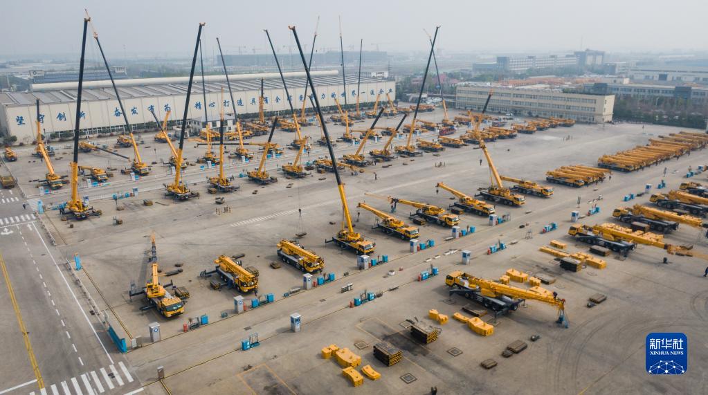 這是2019年4月4日在徐工集團徐州重型機械有限公司拍攝的調試中的起重機(無(wú)人機拍攝)。新華社記者 李響 攝