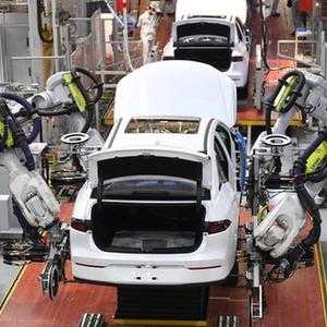在廣州市番禺區的廣汽埃安新能源汽車(chē)股份有限公司總裝生產(chǎn)線(xiàn),機器人手臂在安裝汽車(chē)輪胎(2023年2月24日攝)。新華社記者 鄧華 攝