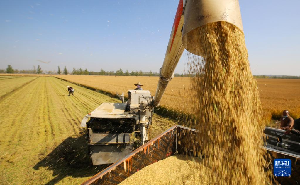 山東省臨沂市郯城縣郯城街道農民將收獲的水稻裝車(chē)(2022年10月23日攝)。新華社發(fā)(張春雷攝)