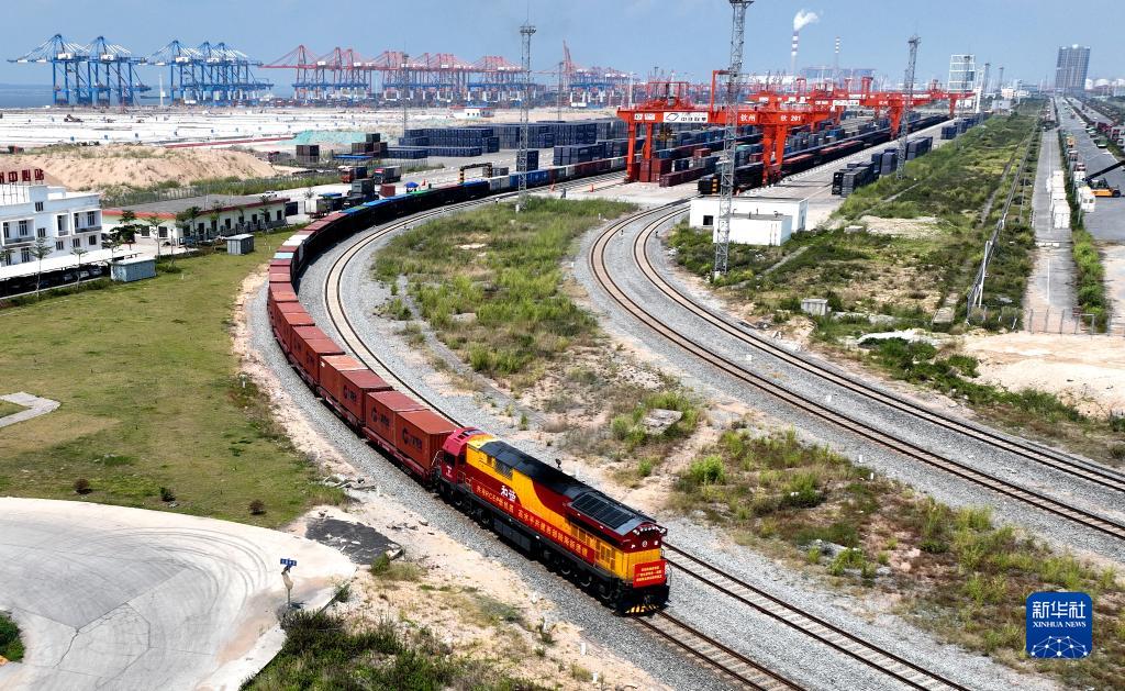 這是從廣西欽州港發(fā)出的首趟“北部灣—西藏”班列(2022年9月17日攝,無(wú)人機照片)。新華社記者 張愛(ài)林 攝