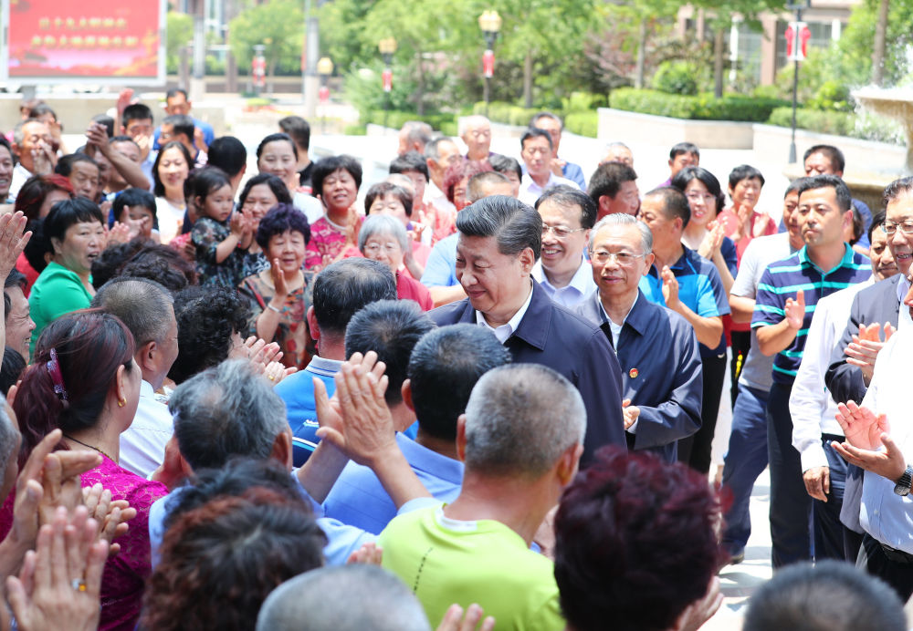 ↑2018年6月12日,習近平在山東省青島市李滄區世園街道上流佳苑社區同居民親切握手。