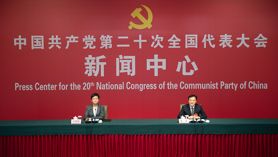 10月21日,二十大新聞中心舉辦第五場(chǎng)記者招待會(huì ),請生態(tài)環(huán)境部黨組成員、副部長(cháng)翟青圍繞“建設人與自然和諧共生的美麗中國”主題與記者交流。圖為記者招待會(huì )現場(chǎng)。(新華網(wǎng) 劉廈 攝)