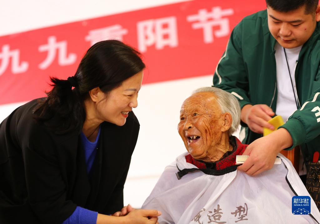 2022年10月4日,在山東省滕州市一家養老院,社會(huì )工作者為老人理發(fā)。新華社發(fā)(李志軍 攝)