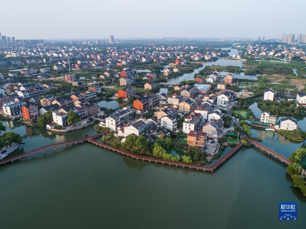 空中俯瞰杭州市余杭區塘棲古鎮丁山湖邊的水上棧道和丁河村(2019年8月7日攝,無(wú)人機照片)。新華社記者 徐昱 攝