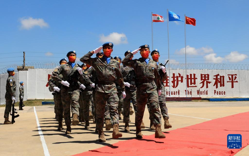 在黎巴嫩南部辛尼亞村的中國維和部隊營(yíng)區,中國維和部隊官兵在受勛后通過(guò)觀(guān)禮臺(2022年7月1日攝)。新華社記者 劉宗亞 攝