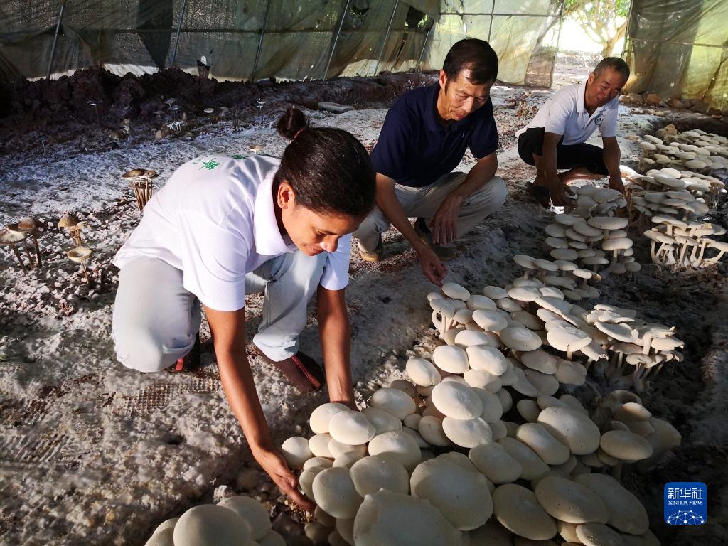 在斐濟楠迪,中國專(zhuān)家和當地雇員檢查菌菇生長(cháng)情況(2018年6月12日攝)。新華社記者 張永興 攝