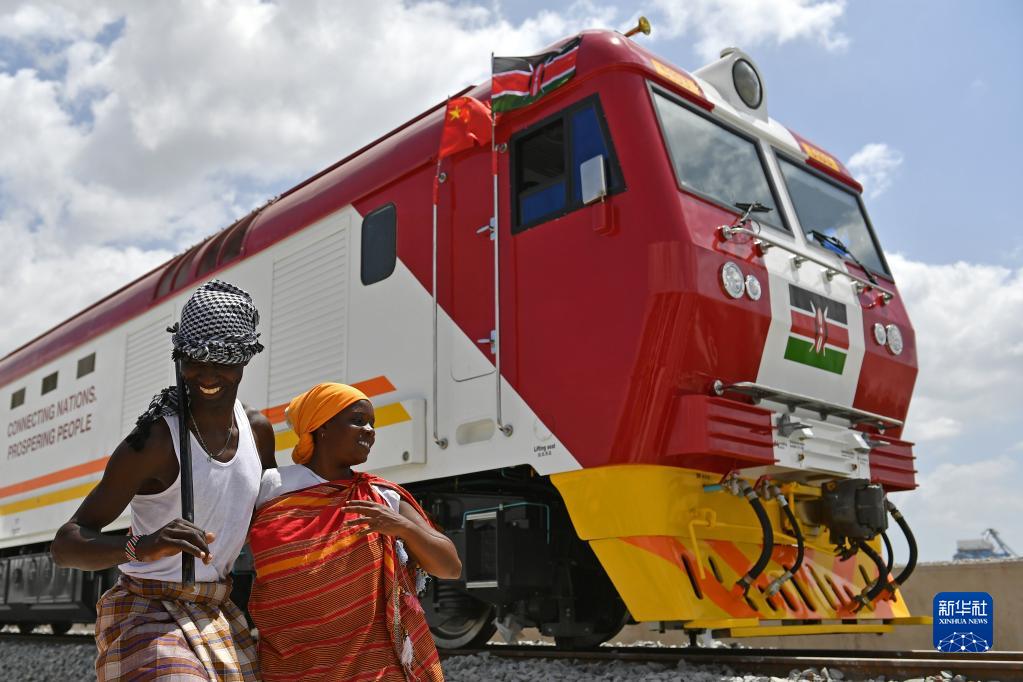 在肯尼亞蒙巴薩,當地民眾在中國承制的蒙內鐵路首批內燃機車(chē)旁載歌載舞(2017年1月11日攝)。新華社記者 孫瑞博 攝
