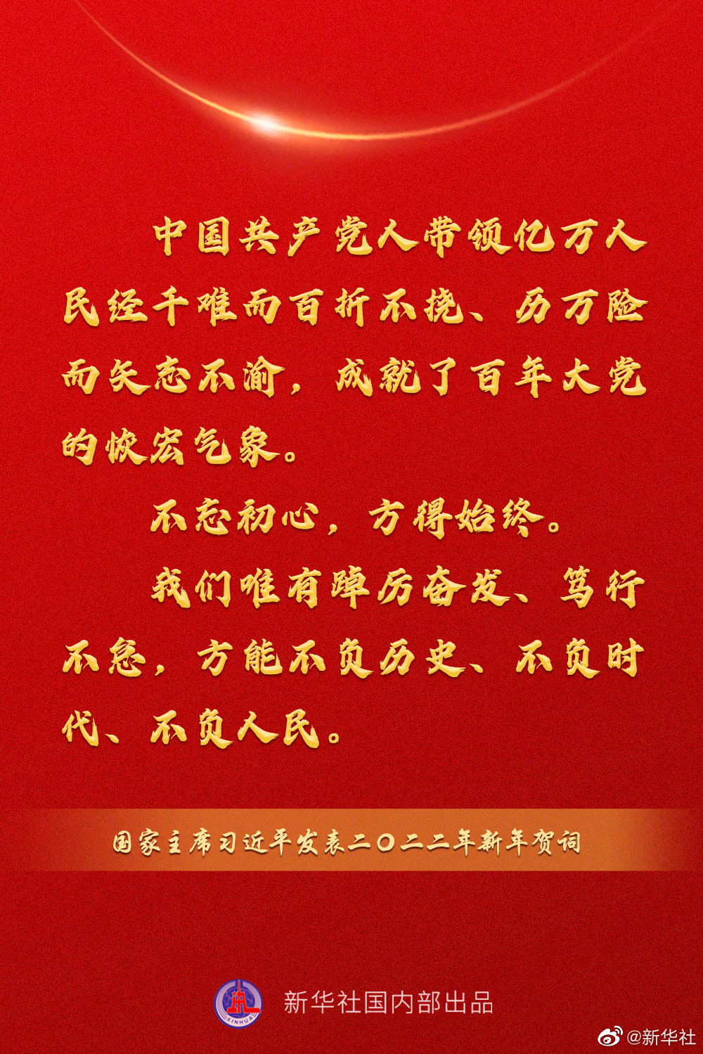 習近平:中國共產(chǎn)黨人帶領(lǐng)億萬(wàn)人民經(jīng)千難而百折不撓、歷萬(wàn)險而矢志不渝,成就了百年大黨的恢宏氣象。不忘初心,方得始終。我們唯有踔厲奮發(fā)、篤行不怠,方能不負歷史、不負時(shí)代、不負人民。?