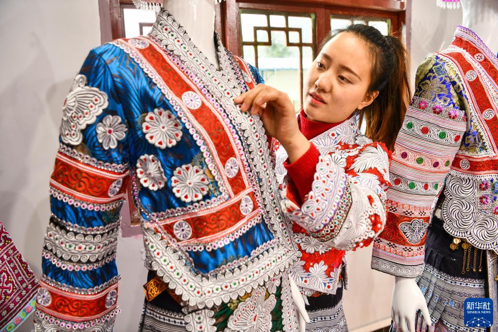 在貴州省畢節市黔西縣新仁苗族鄉化屋村麻窩寨易地扶貧搬遷集中安置點(diǎn),苗族繡娘楊文麗整理苗族服飾(2021年2月20日攝)。新華社記者 楊文斌 攝