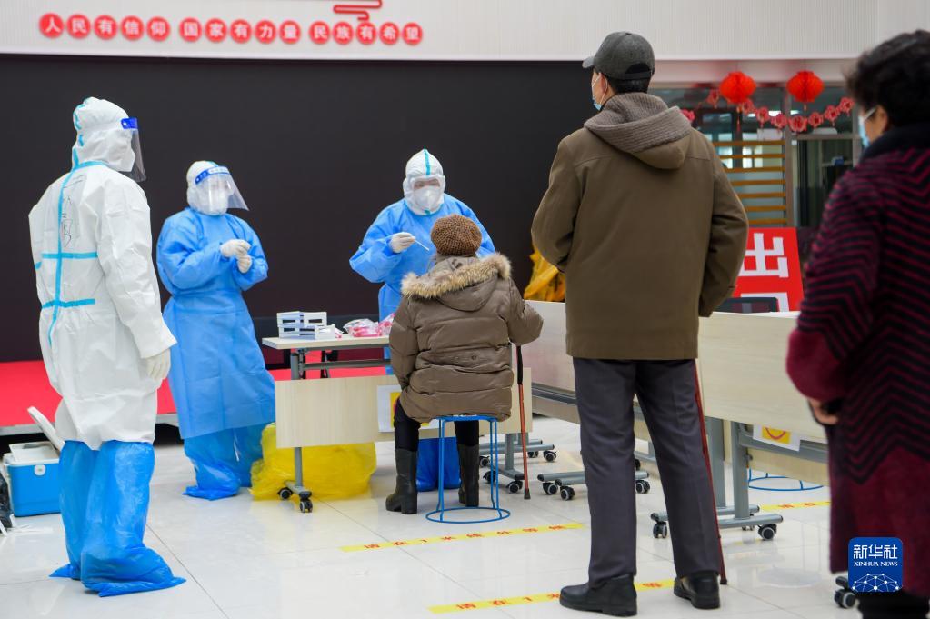 在內蒙古滿(mǎn)洲里市東山街道辦事處怡園社區府欣小區A區核酸采樣點(diǎn),工作人員為居民做核酸采樣(2021年11月29日攝)。新華社記者 李志鵬 攝