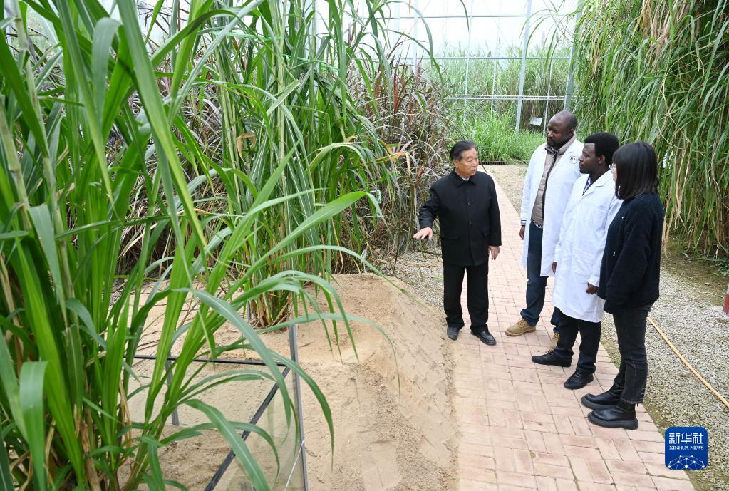 2021年11月23日,福建農林大學(xué)菌草專(zhuān)家林占熺(左一)在國家菌草工程技術(shù)研究中心菌草種質(zhì)資源圃給外國留學(xué)生(左二、左三)講解菌草的種植培育技術(shù)。新華社記者 林善傳 攝