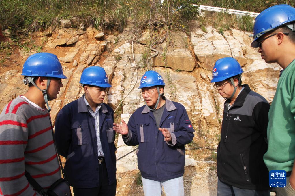 天文學(xué)家南仁東(中)與工程技術(shù)人員在大窩凼施工現場(chǎng)檢查施工進(jìn)展(2014年12月1日攝)。新華社發(fā)(中科院國家天文臺供圖)