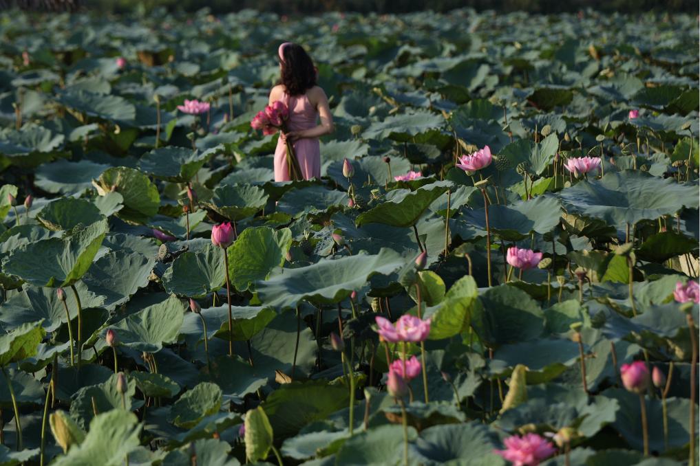 這是2020年7月15日,一名女子在越南首都河內西湖畔的荷花叢中留影。