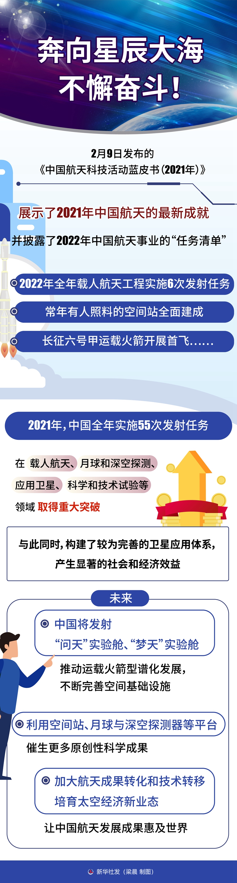 2022年全年載人航天工程實(shí)施6次發(fā)射任務(wù),常年有人照料的空間站全面建成,長(cháng)征六號甲運載火箭開(kāi)展首飛……9日發(fā)布的《中國航天科技活動(dòng)藍皮書(shū)(2021年)》,展示了2021年中國航天的最新成就,并披露了2022年中國航天事業(yè)的“任務(wù)清單”,一項項舉世矚目的成就和新計劃催人奮進(jìn)。