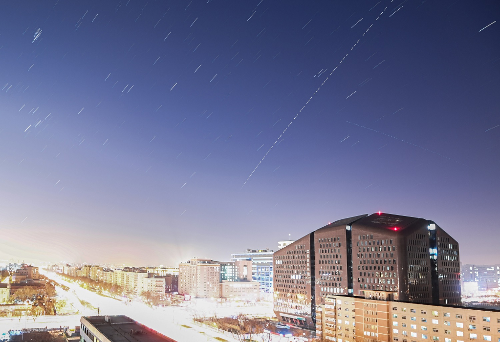 2021年12月19日在北京宣武門(mén)拍攝的中國空間站過(guò)境照片(軌跡為多張照片堆棧)。新華社記者 陳曄華 攝