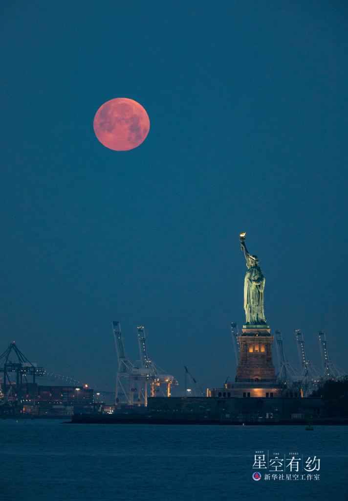 這是2021年5月26日在美國紐約拍攝的自由女神像上空的圓月。當日,年度“最大滿(mǎn)月”恰逢月全食。(新華社記者王迎攝)