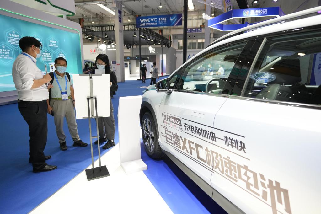 8月26日,2022世界新能源汽車(chē)大會(huì )上,工作人員向參觀(guān)者介紹一款搭載可快速充電電池的新能源汽車(chē)。新華社記者 鞠煥宗 攝
