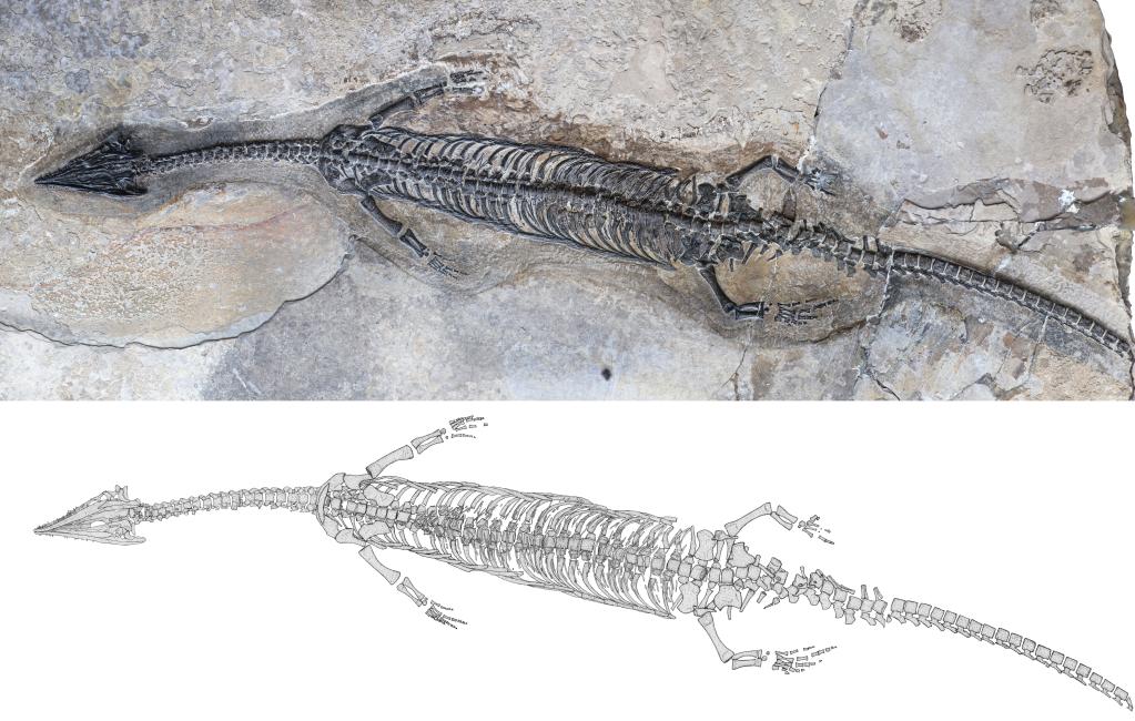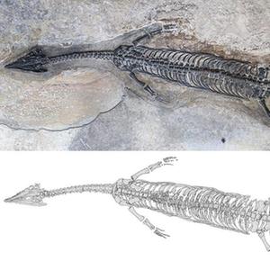 奇異羅平龍尖嘴長(cháng)吻,形似“四腳蛇”,全長(cháng)超半米。它的體形像水生蜥蜴,是一種新的腫肋龍科爬行動(dòng)物。